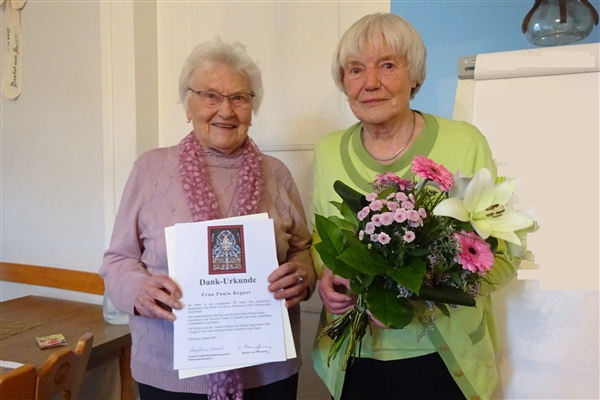 Nun ist sie ein Vierteljahrhundert dabei, ein guter Anlass, beim Seniorennachmittag im Februar im Pfarrhaus Obereschenbach auch sie zu ehren. Die Gemeindeteam-Mitglieder Margarita Reuter und Hiltrud Lehmann überreichten einen Blumenstrauß und Pastoralreferent Markus Waite eine Dank-Urkunde des Bischofs, begleitet vom Applaus der Anwesenden. Sie dankten Paula Bogner für 25 Jahre Treue zum Seniorenkreis, in denen ihr die Obereschenbacher Senior*innen am Herzen liegen; für 25 Jahre immer wieder Ideen Produzieren, für schöne und erlebnisreiche Treffen und für 25 Jahre Vorbereiten, Organisieren, Anpacken …