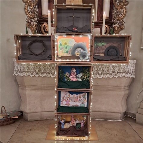 Eine besondere Idee hatte das Team der Kinderkirche in "St. Martin" Untererthal in diesem Jahr: In der Zeit von Palmsonntag bis zur Osternacht entstanden zu den Gottesdiensten gemeinsam mit den Kindern gestaltete Obstkisten, die die verschiedenen Szenen der Leidensgeschichte darstellen - beginnend mit dem Einzug nach Jerusalem über das letzte Abendmahl, den Ölberg und die Kreuzigung bis hin zur Auferstehung. Das daraus entstandene Kreuz bleibt bis Pfingsten in der Kirche aufgestellt.