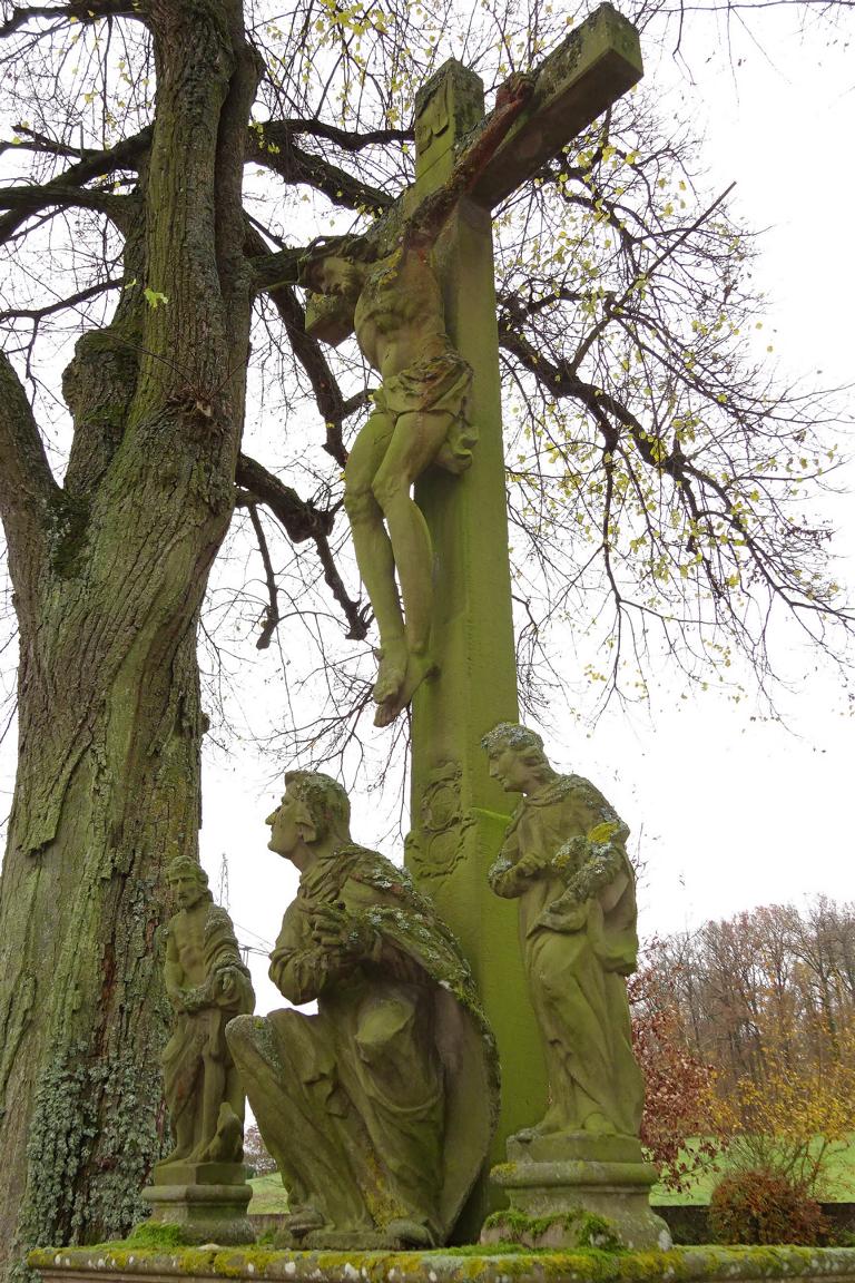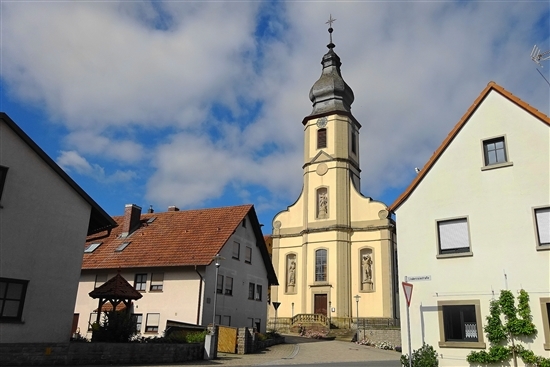 Der Hochaltar wird 1792 eingebaut und stammt vom Schreiner Andreas Schmitt aus Eußenheim sowie dem Bildhauer Jörg Schreiner aus Karlstadt. Er bleibt roh und unbemalt und wird erst fast 50 Jahre 1839 gefasst sprich marmoriert bemalt. Die zwei überlebensgroßen Bischofsfiguren stellen den Heiligen Bonifatius (rechts) und den Heiligen Kilian (links) dar.